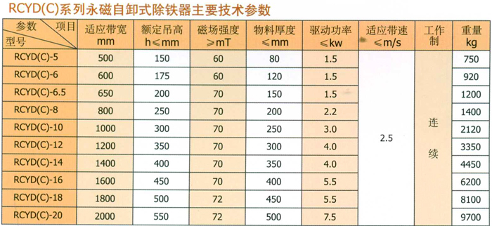 RCYD(C)系列永磁自卸式除鐵器是由高性能永磁磁芯、棄鐵皮帶、減速電機(jī)、框架、滾筒等部件組成,與各種輸送機(jī)配套使用。用于從非磁性物料中自動(dòng)清除0.1-25公斤重的鐵磁性物質(zhì)。